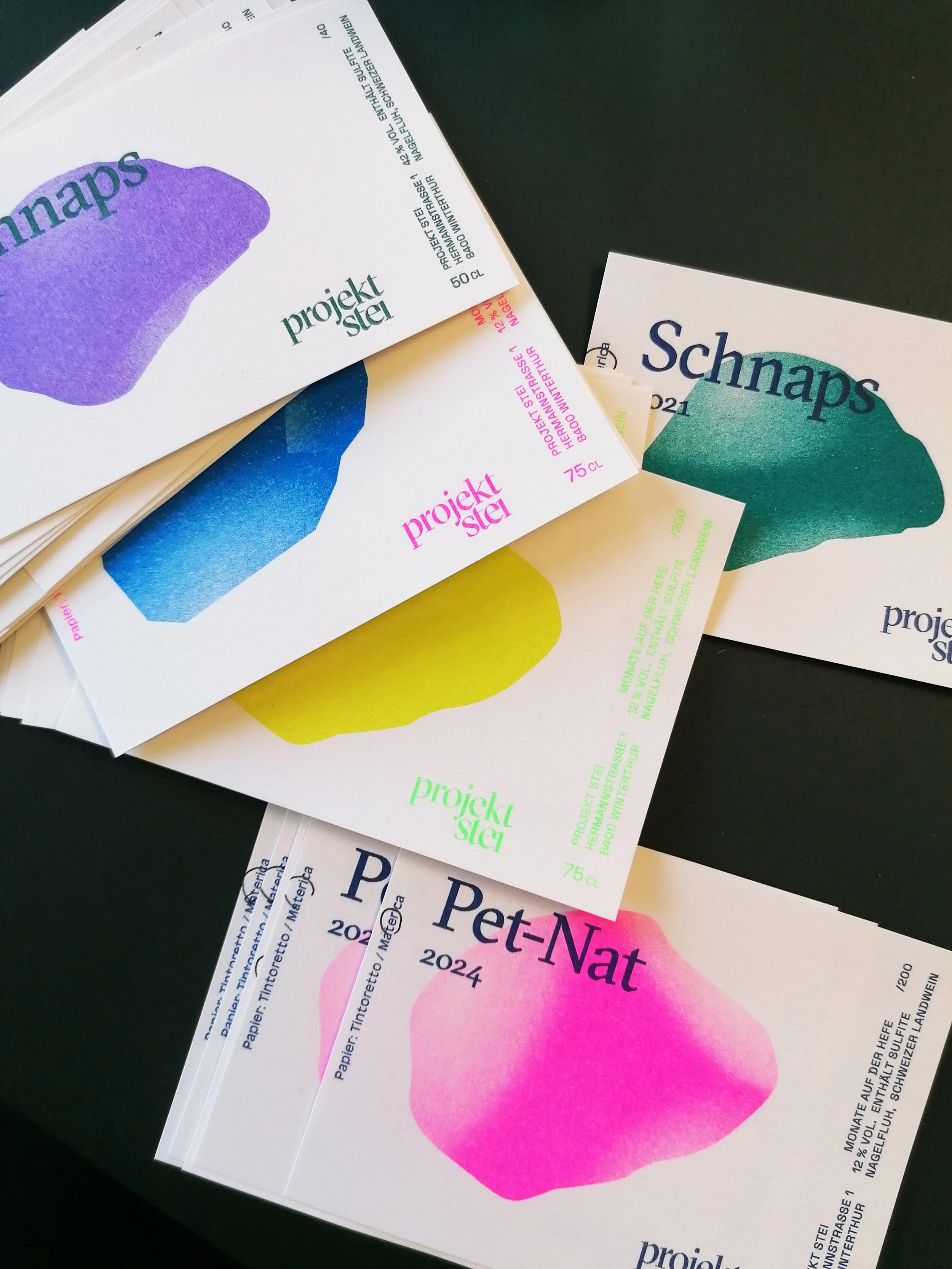Projekt Stei – zwei Freunde, eine Schnapsidee. Visuelle Identität für den handgemachten Schaumwein und Schnaps aus Stein am Rhein. Die illustrierten Steine stammen aus dem Rebberg aus Steillage auf Nagelfluh. Die Etiketten sind mit umweltfreundlicher Risographie gedruckt.